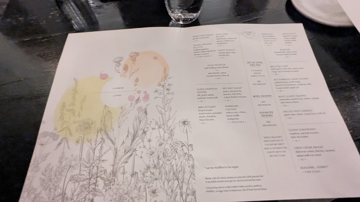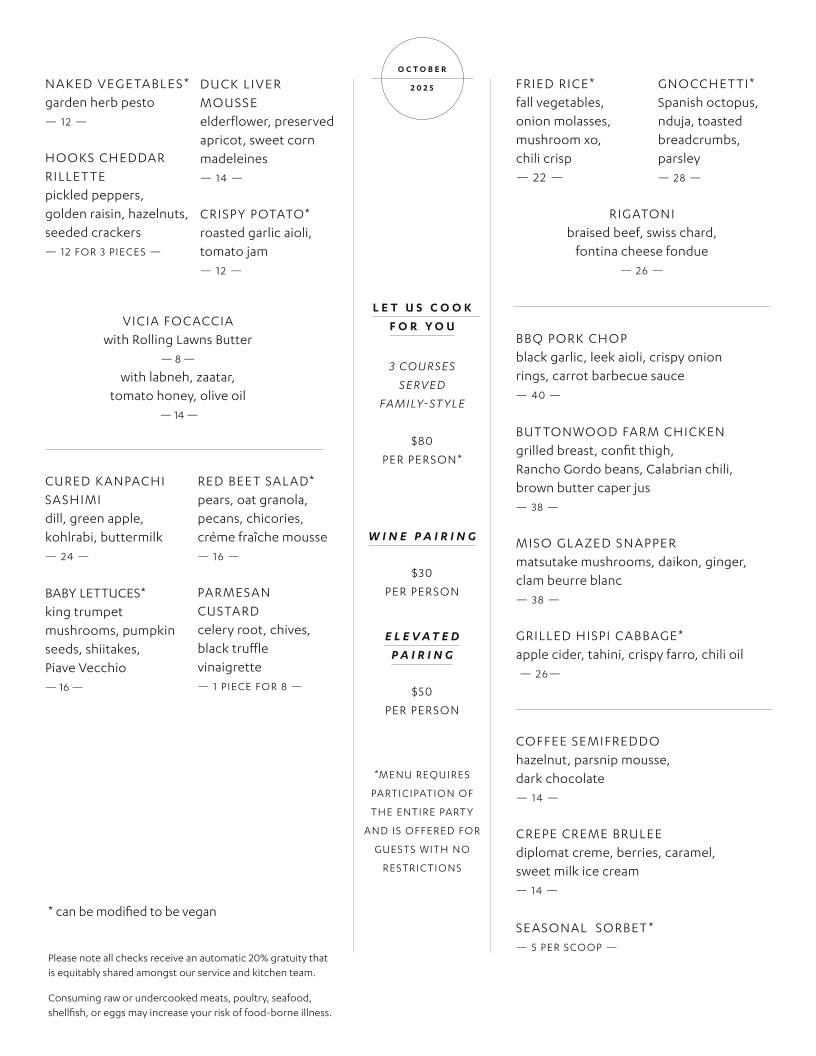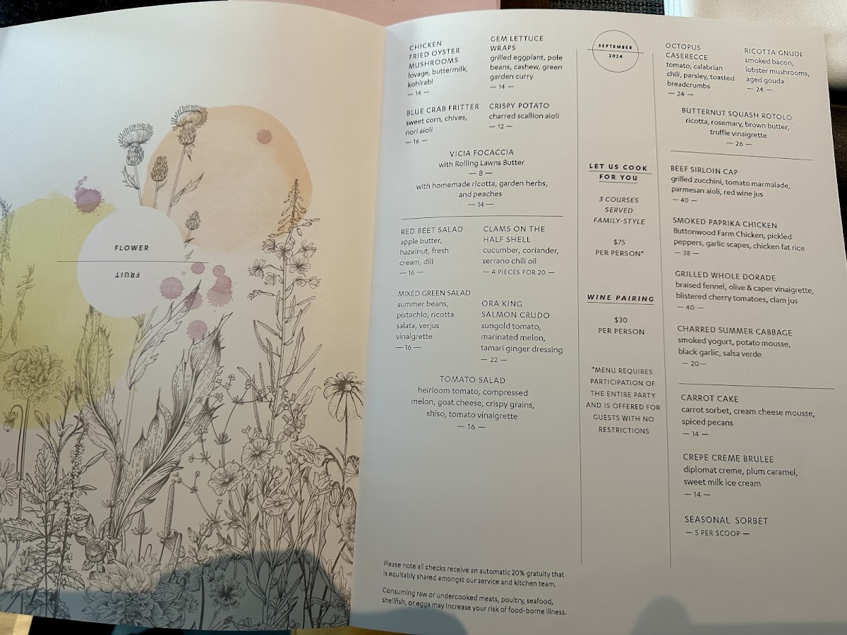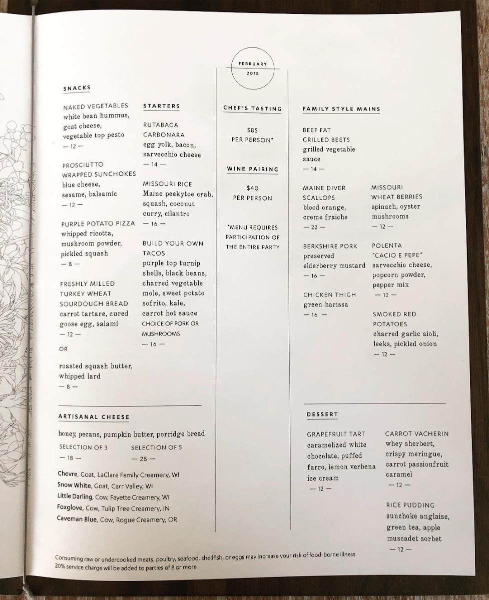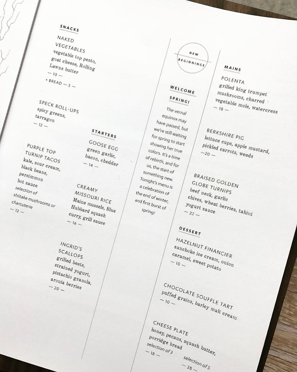 The menu highlights a range of inventive dishes like shiitake mushroom tacos served in kohlrabi shells, seasonal vegetables prepared with care, and unique flavor combinations such as mole and squash. Alongside these are comforting plates such as steak and the farmers’ dinner for one, designed to showcase the well-sourced, seasonal produce.